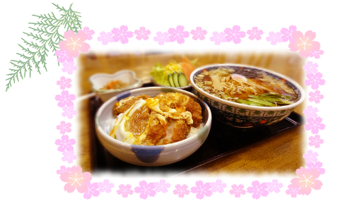 ボリュームたっぷりの白河ラーメンにミニカツ丼…そして野菜サラダと日替わり小鉢、漬物がついて1380円。とてもお得なセットとなっております。一人では食べきれない場合もありますのでご注意を…。